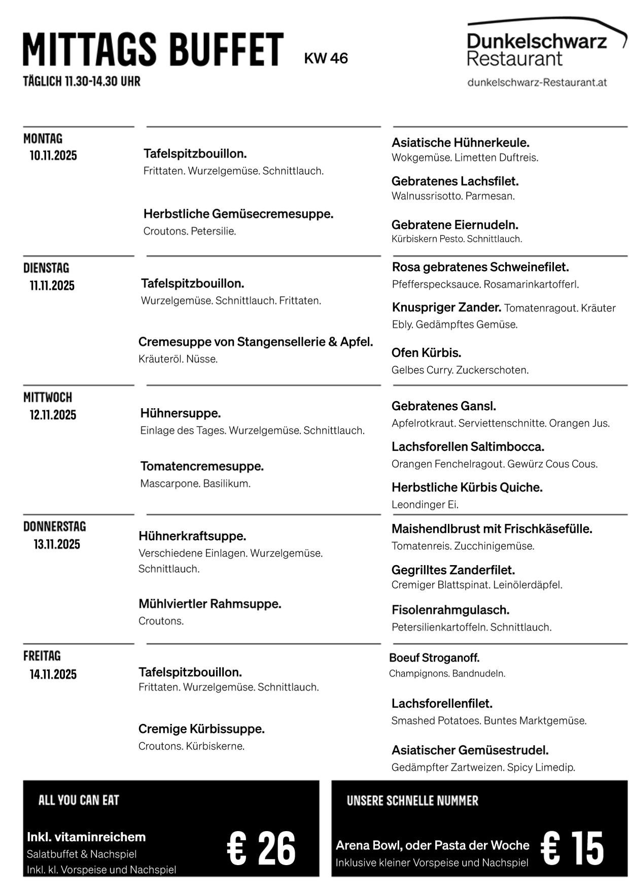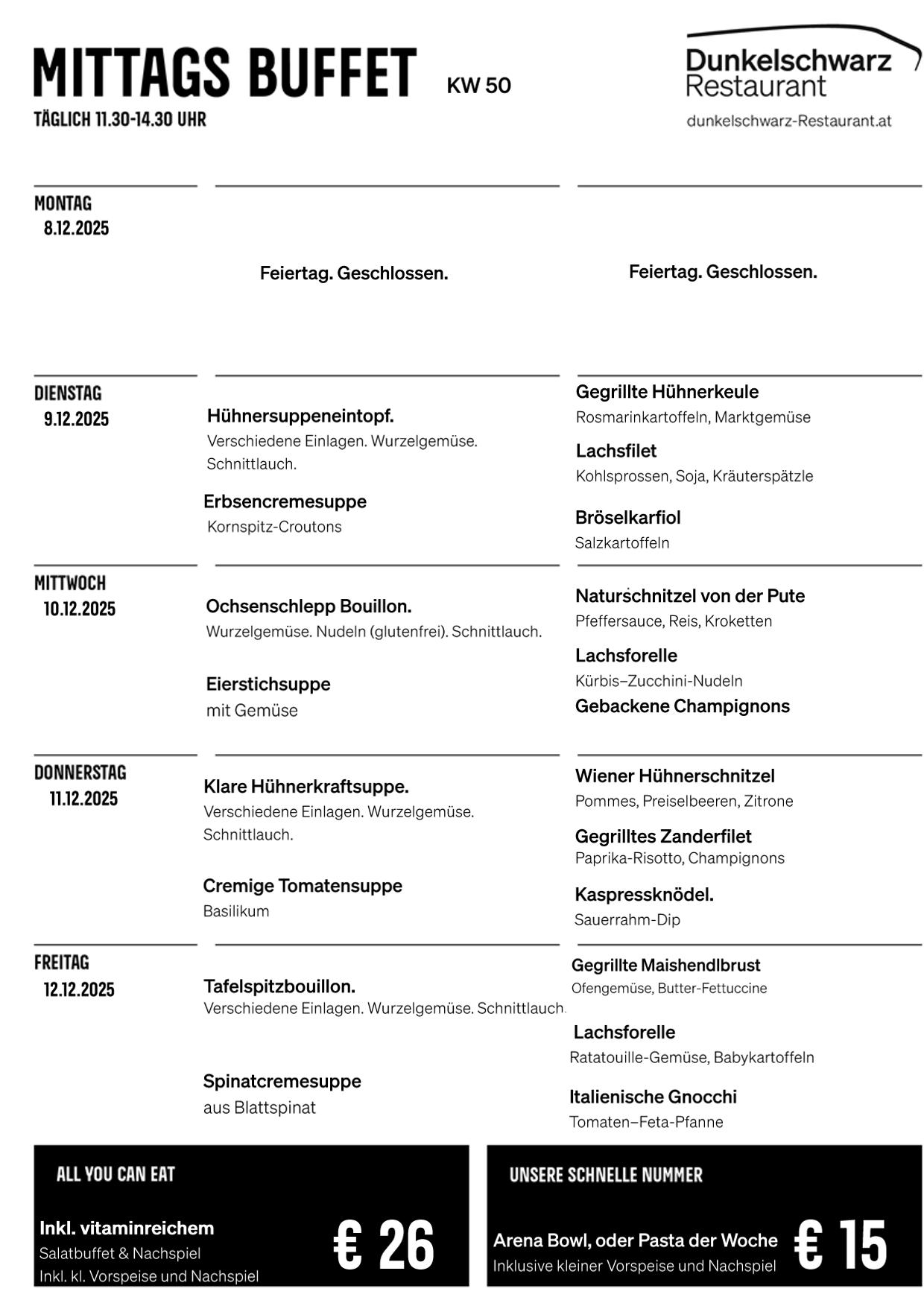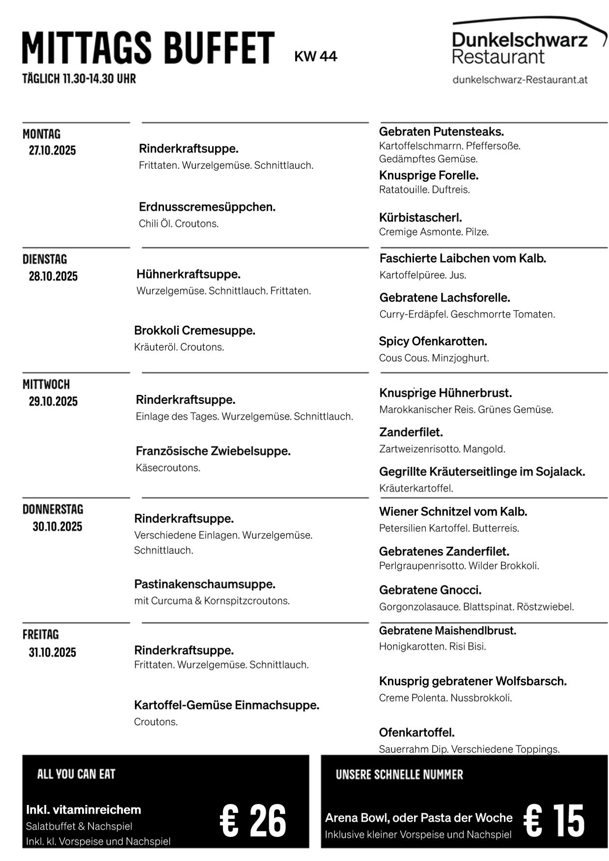 Ein wechselndes Mittagsbuffet, á la carte Spezialitäten des Hauses oder ein schneller, gesunder Snack am Nachmittag?